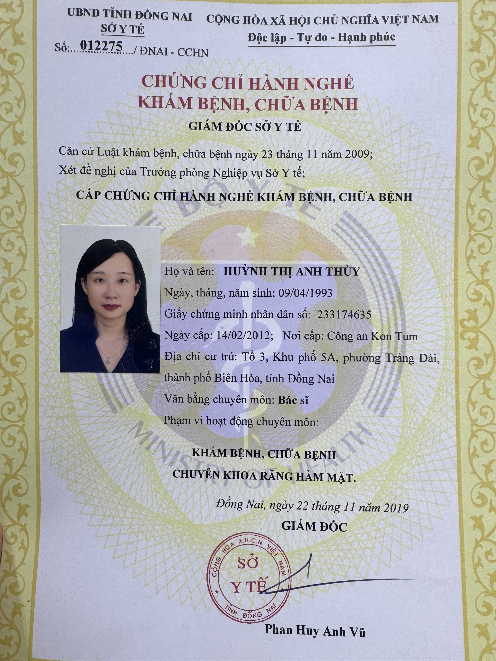 Bác sĩ Huỳnh Thị Anh Thùy sinh ra và lớn lên tại Kon Tum. Bác sĩ tốt nghiệp khoa Răng Hàm Mặt tại trường ĐHYD, TPHCM. Quan điểm điều trị của Thùy là luôn nỗ lực làm tốt nhất trong khả năng của mình với mục tiêu xâm lấn tối thiểu và bảo tồn mô răng thật tối đa. Không chỉ điều trị, bác Thùy còn mong muốn có thể trò chuyện và thay đổi nhận thức của bệnh nhân về cách bảo vệ và trân trọng hàm răng thật của mình.
