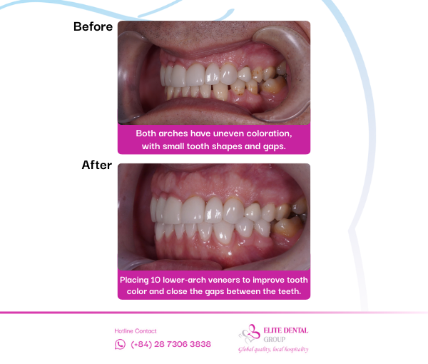 Applying Elite Dental’s treatment philosophy – “Maximum Preservation, Minimal Intervention” – she recommended placing 10 lower-arch veneers to improve symmetry and colour while preserving the natural structure of his teeth.