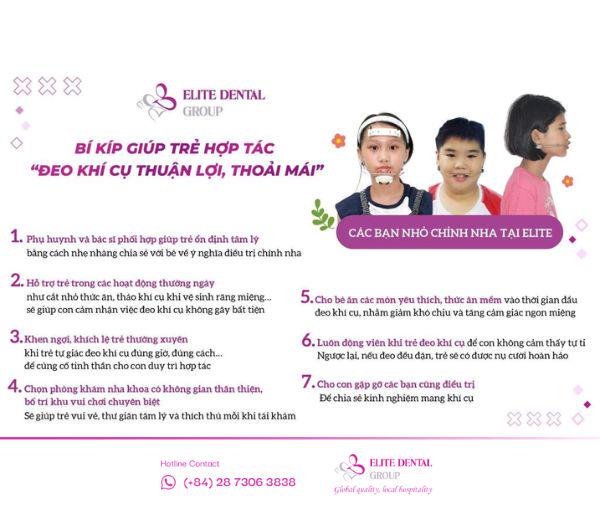 Lựa chọn Elite Dental để bắt đầu hành trình chỉnh nha cho trẻ, phụ huynh hoàn toàn an tâm bởi đội ngũ bác sĩ giàu kinh nghiệm, chuyên môn cao, giúp lập kế hoạch di chuyển răng đúng và tư vấn hàm Facemask phù hợp. Đồng thời, các bác sĩ còn rất tâm lý, nhẹ nhàng, trò chuyện để giúp trẻ hợp tác đeo khí cụ tốt nhất, giúp trẻ sớm sở hữu hàm răng chắc khỏe – nụ cười tự tin, rạng rỡ. Phòng khám còn có “ngân hàng” các ca chỉnh nha thành công để phụ huynh tham khảo, hình dung được kết quả sau cùng để thêm an tâm khi cho trẻ điều trị.