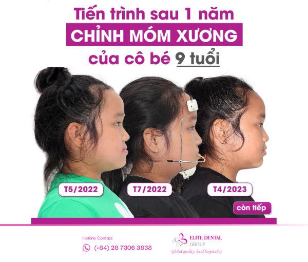 Bé gái 9 tuổi đến Elite Dental trong tình trạng móm xương, vùng răng cửa nằm kẹt bên trong hàm dưới, khuôn mặt bị gãy và lõm. Sau khi thăm khám và và ghi lại các hình ảnh chụp cận răng, hình ảnh phim chụp X-quang vùng răng, xương hàm và sọ nghiêng, bác sĩ lên kế hoạch niềng răng cho trẻ như sau: Chỉnh xương với khí cụ Facemask để sửa chữa móm xương. Và giai đoạn 2 sẽ gắn mắc cài, theo dõi thay răng, sắp xếp làm đều răng và chỉnh cho khớp cắn đúng. Sau một thời gian điều trị, tình trạng móm xương của bé được cải thiện rõ rệt, không còn nhìn thấy móm ở các góc thẳng, góc nghiêng nữa.