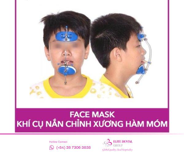Facemask là loại hàm chức năng giúp chỉnh hình xương, cải thiện tình trạng khớp cắn ngược (móm xương) ở trẻ em, thường được dùng cho trẻ đang trong giai đoạn phát triển xương hàm và thay răng từ 6 – 12 tuổi. Theo đó, Facemask sử dụng lực ngoài miệng tác động và kích thích xương hàm trên tăng trưởng ra trước – và xuống dưới, đồng thời kiểm soát sự phát triển của xương hàm dưới. Nhờ vậy, khi kết hợp hàm Facemask vào quá trình điều trị giúp trẻ hỗ trợ giảm móm và đưa hàm trên về khớp cắn chuẩn sinh lý.