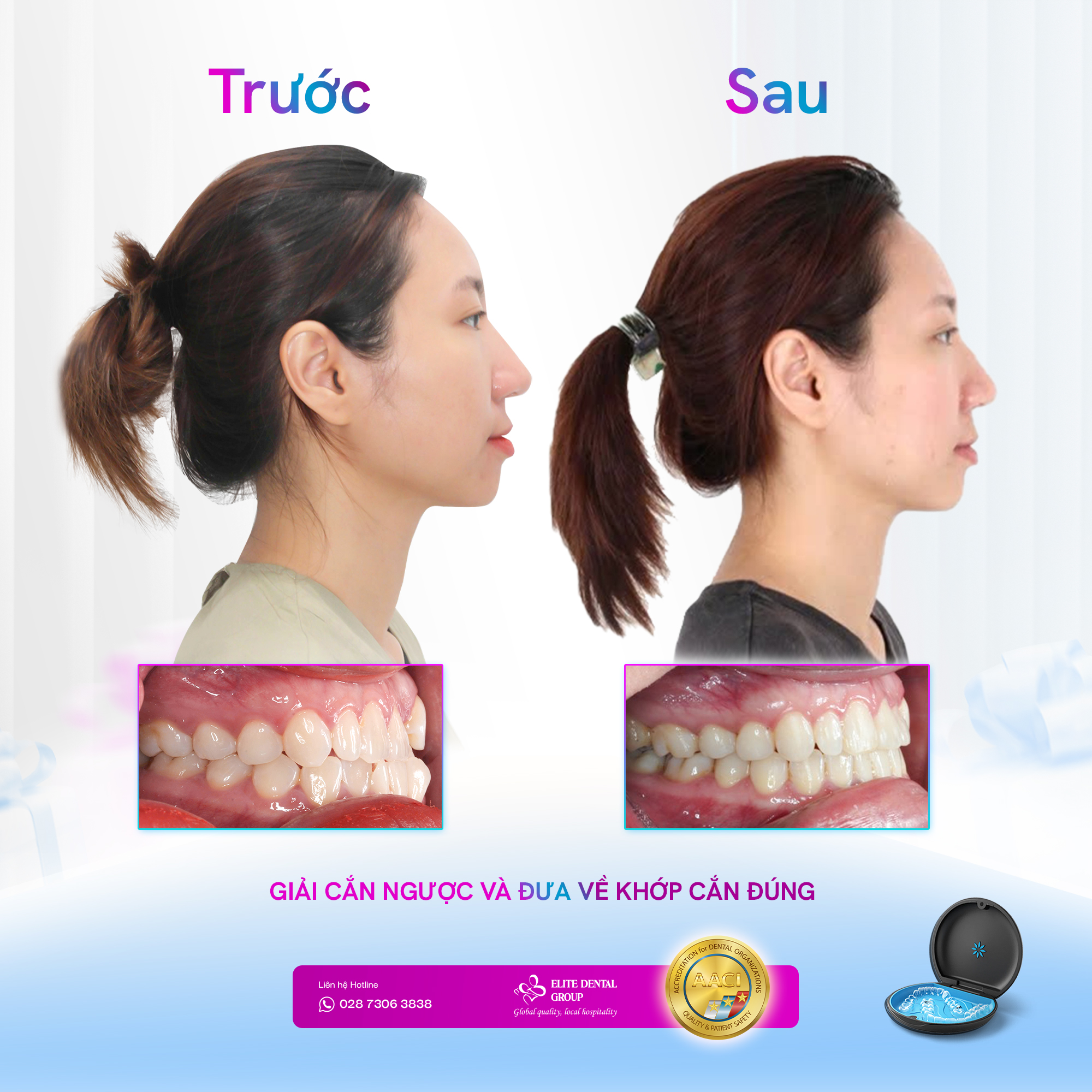 Sau thời gian kiên trì đồng hành cùng đội ngũ Elite Dental, kết quả mang lại đã làm T.D hài lòng. Không chỉ là hàm răng đều đặn và khớp cắn đúng. Mà còn cải thiện đáng kể tình trạng lệch mặt và độ nghiêng mặt phẳng nhai. Nhờ đó, gương mặt T.D trở nên hài hòa và cân đối hơn. Đây là một sự kết hợp đẹp giữa thẩm mỹ nụ cười và chức năng.