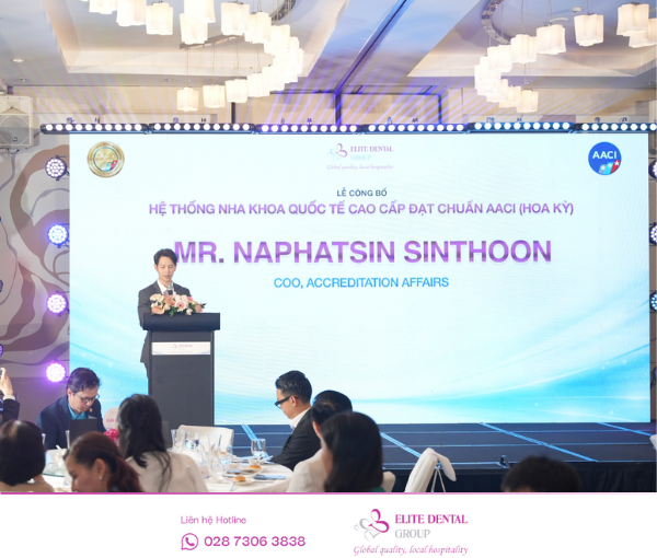 Đại diện AACI Châu Á – Thái Bình Dương, Ông Naphatsin Sinthoon, gửi lời chúc mừng Elite Dental trở thành hệ thống nha khoa đầu tiên tại Việt Nam được trao chứng nhận AACI.