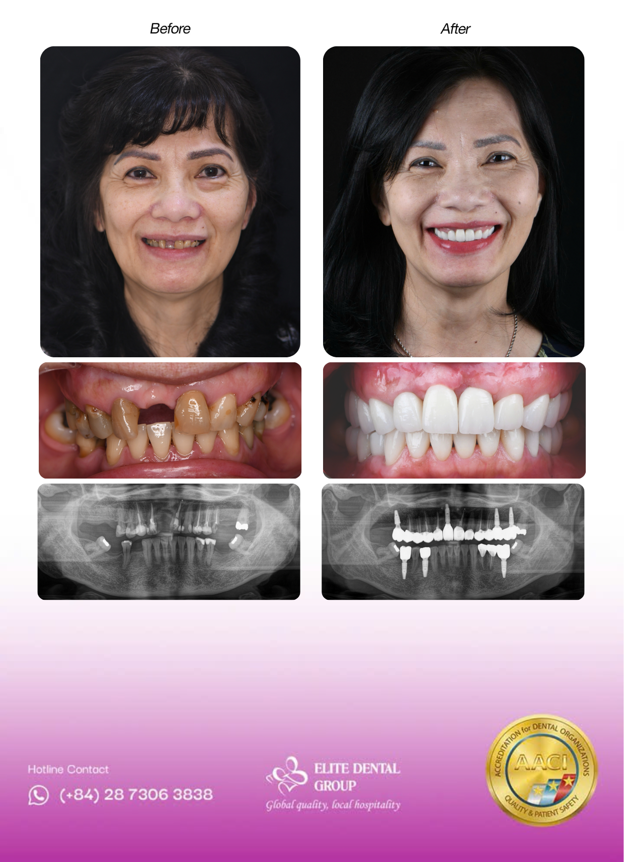 Như trường hợp của bệnh nhân nữ, gần 45 tuổi, tìm đến Elite với mong muốn khôi phục 2 răng cửa hàm trên để lấy lại sự tự tin và ăn nhai thoải mái. Qua các bước kiểm tra, chụp phim, bác sĩ xác định răng cửa của chị bị tiêu xương nhưng vẫn có thể điều trị bằng phương pháp trồng răng Implant. Trải qua hơn 6 tháng điều trị tại Elite Dental, bệnh nhân đã lấy lại được hàm răng khỏe mạnh, các chức năng ăn nhai hồi phục. Đặc biệt kích thước răng cửa tương thích với hàm cắn đảm bảo sự hài hòa cho khuôn mặt cùng tính thẩm mỹ đạt như mong muốn khách hàng.