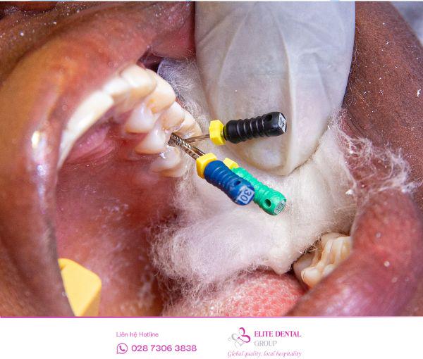 Mở tủy và lấy sạch tủy viêm: Dụng cụ nội nha chuyên dụng được dùng để loại bỏ toàn bộ mô tủy bị viêm hoặc hoại tử.