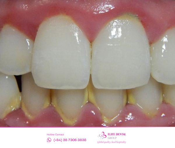 - Tụt nướu: Bạn sẽ cảm thấy răng mình trông “dài hơn” trước. Đó là do nướu bị co rút lại, làm lộ phần chân răng vốn nhạy cảm, gây mất thẩm mỹ và khiến răng ê buốt khi ăn nóng, lạnh.